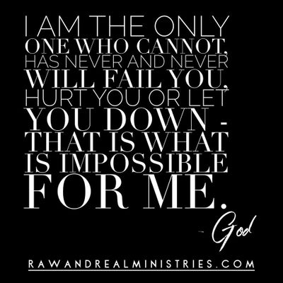 I Am the only one who cannot, has never and never will fail you, hurt you or let you down - that is what IS impossible for Me! I am finishing this thing so you can begin all I have called, chosen and purposed for you...for such a time as this!”, says the Lord.